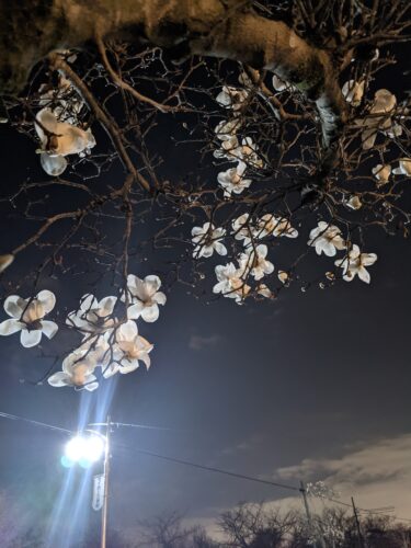 「モクレン通り」と言います!白モクレンが一定間隔で植えられており、見ごろを迎えて